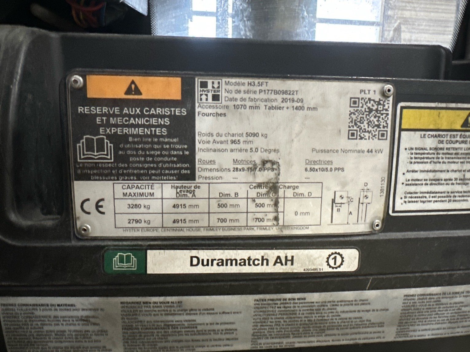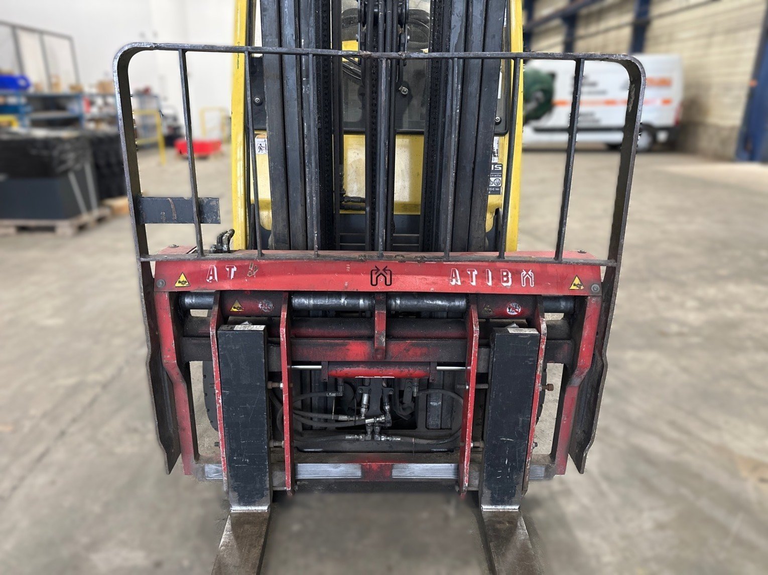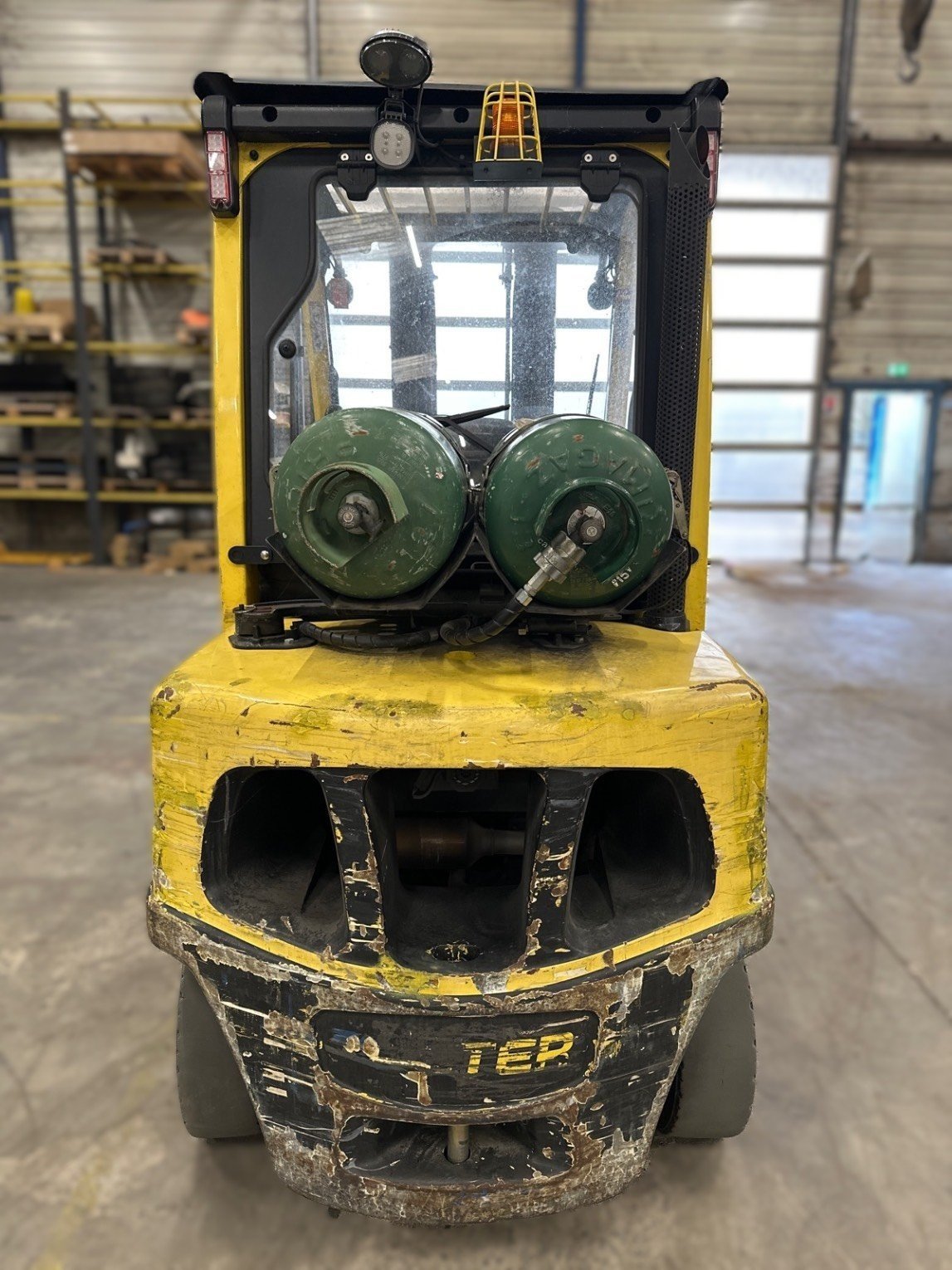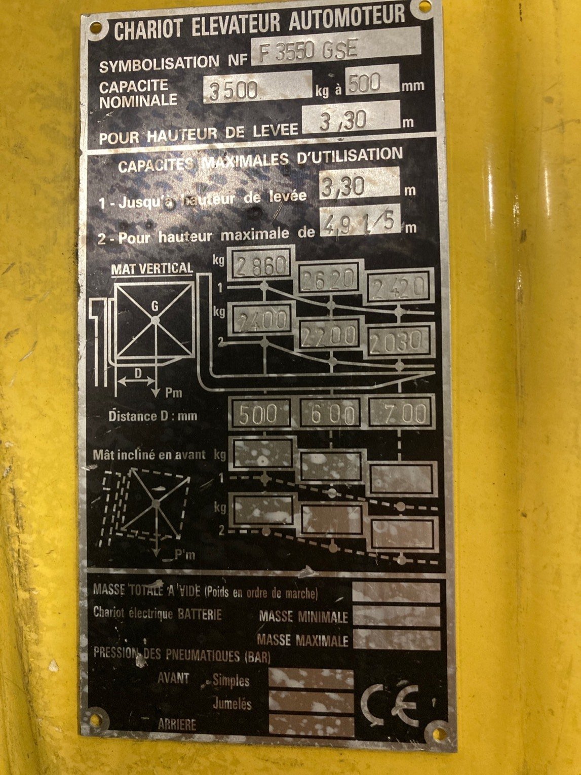 TDL (déplacement latéral), Positionneur de fourches, Dosserêt d'appui de charge, Mini levier, 4 voies hydrauliques, Feu de travail avant, Feux de travail arrière, Feu à éclat, Blue spot arrière, Toit couvert, Pare brise avant, Pare brise arrière