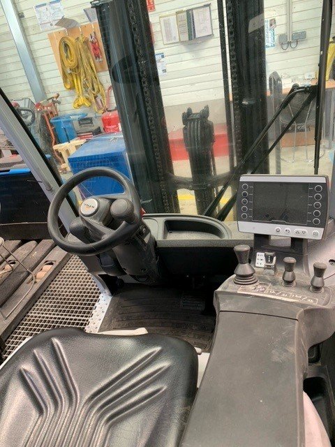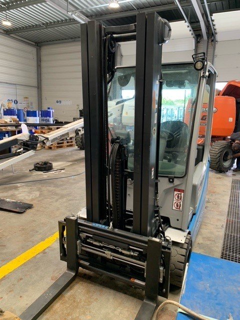 Batterie, Chargeur de batterie, TDL (déplacement latéral), 4 voies hydrauliques, Positionneur de fourches, Dosserêt d'appui de charge, Toit couvert, Pare brise avant, Pare brise arrière, Feu de travail avant, Feux de travail arrière