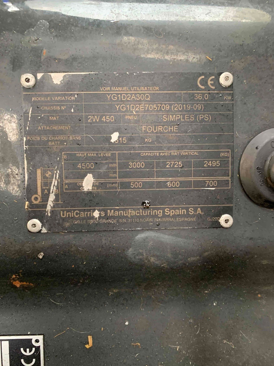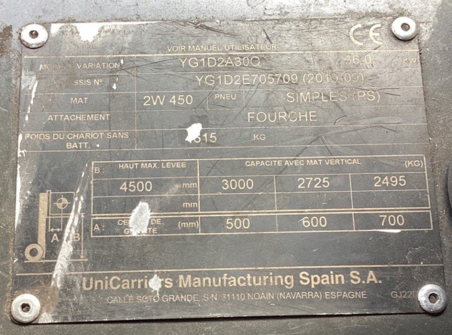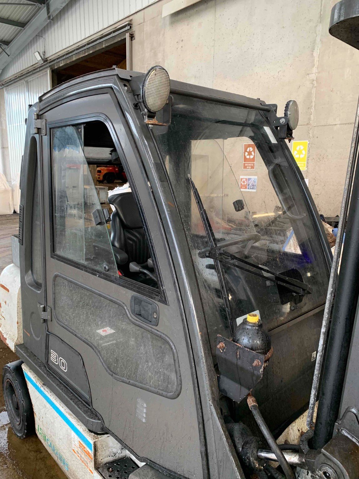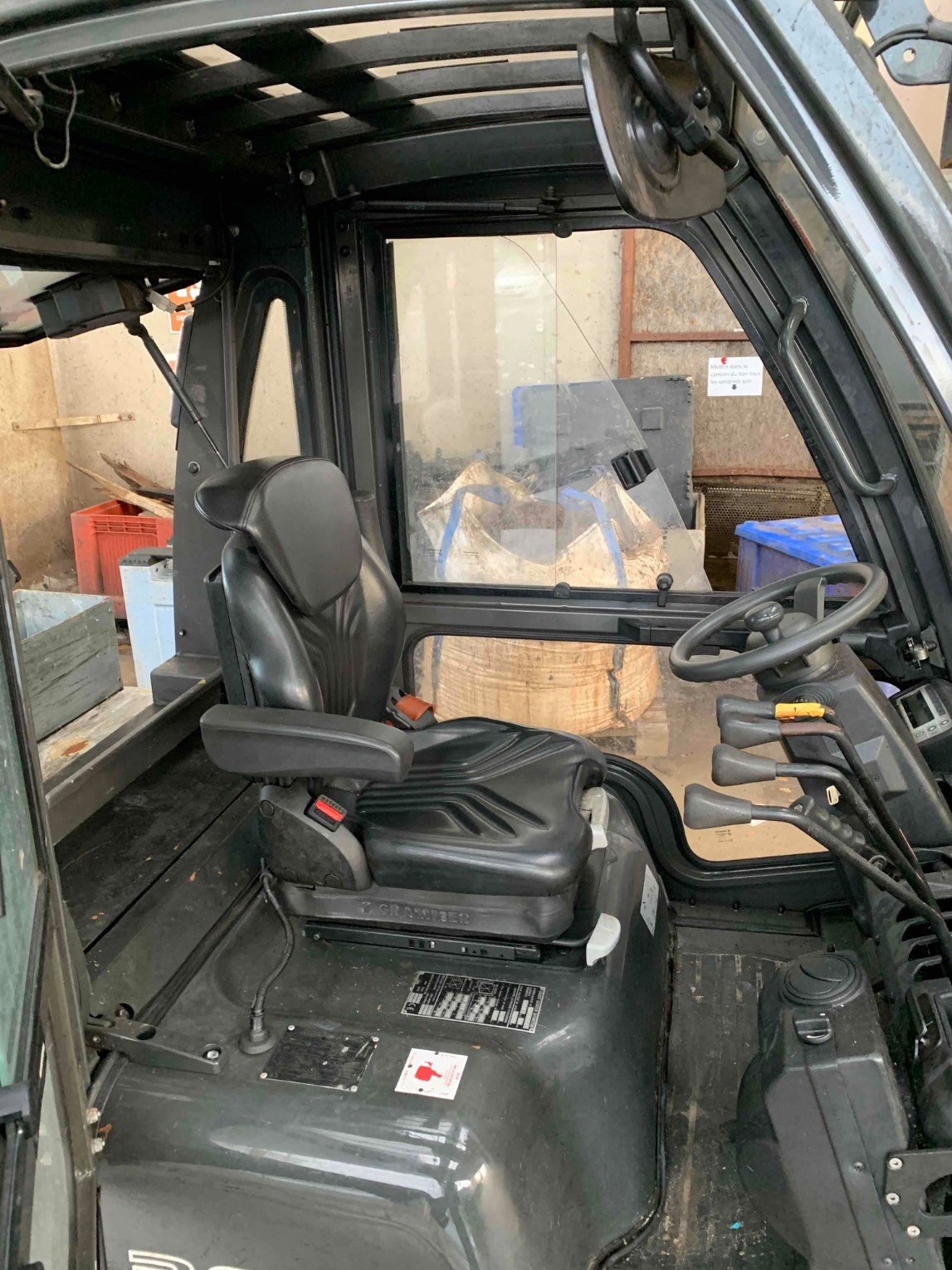 4 voies hydrauliques, Mini levier, Positionneur de fourches, TDL (déplacement latéral), Dosserêt d'appui de charge, Cabine, Éclairage route, Feu à éclat, Retroviseur panoramique